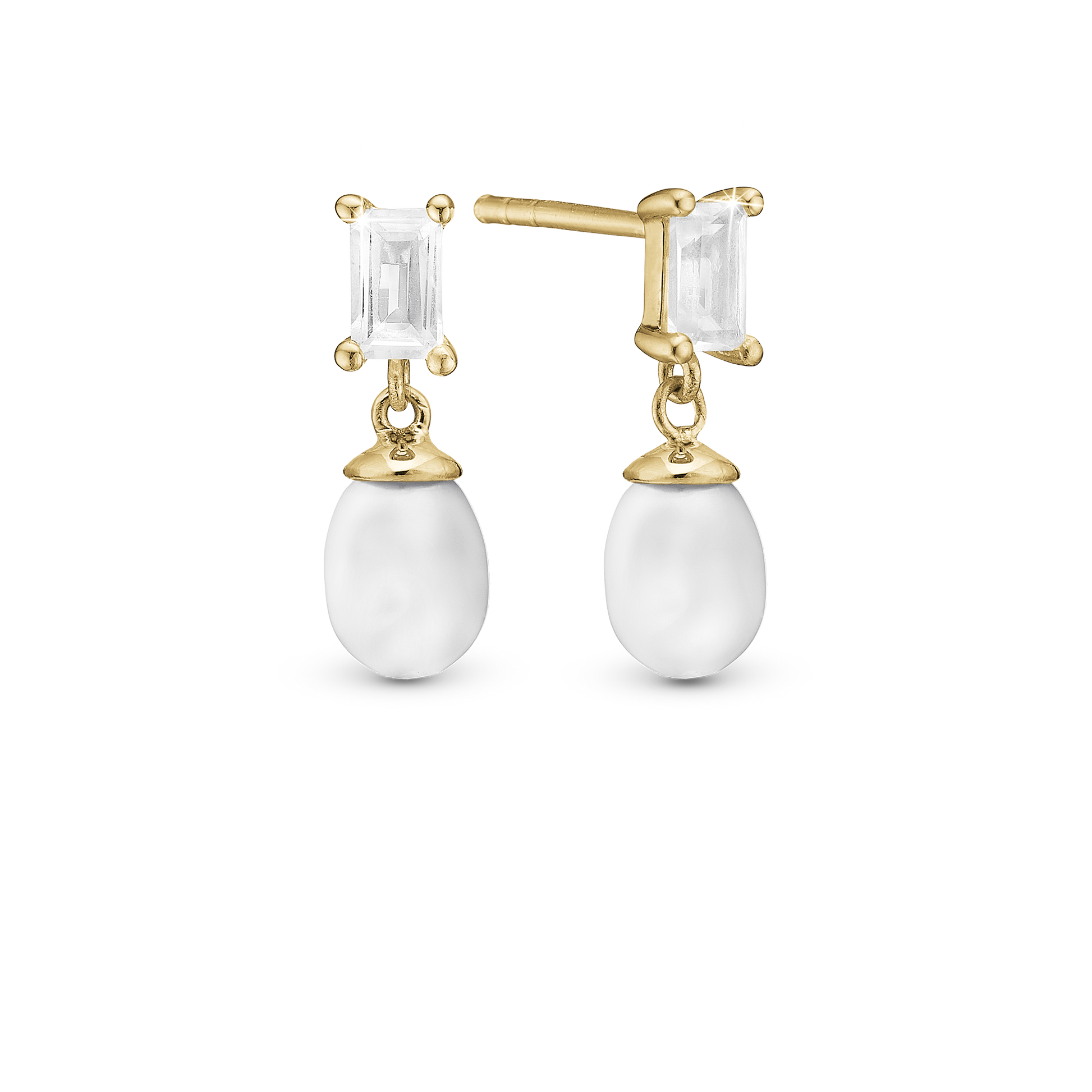Pearl Baguette Stud Earrings - Polished Gold Plated Sterling Silver with 4 white Ferskvandsperler671-G106