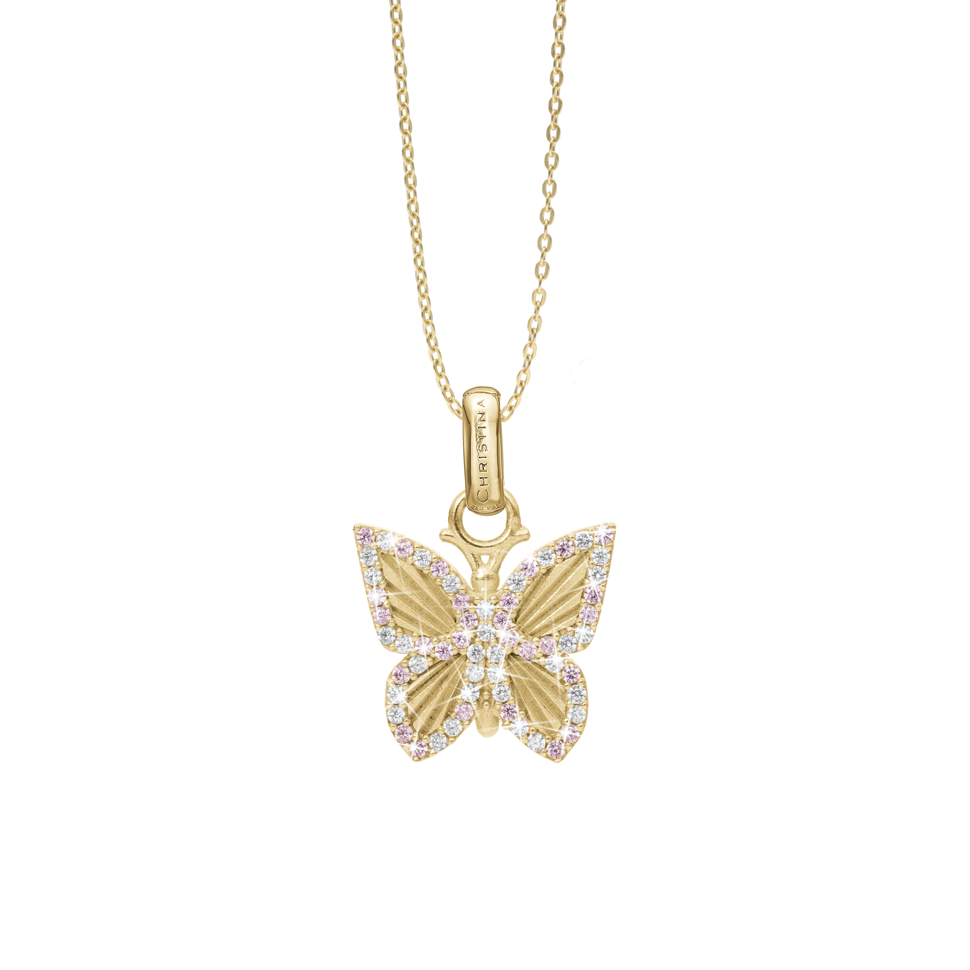 Pretty Butterfly Earring Pendant - Polished Gold Plated Sterling Silver with 32 Pinke Cubic Zirkonia