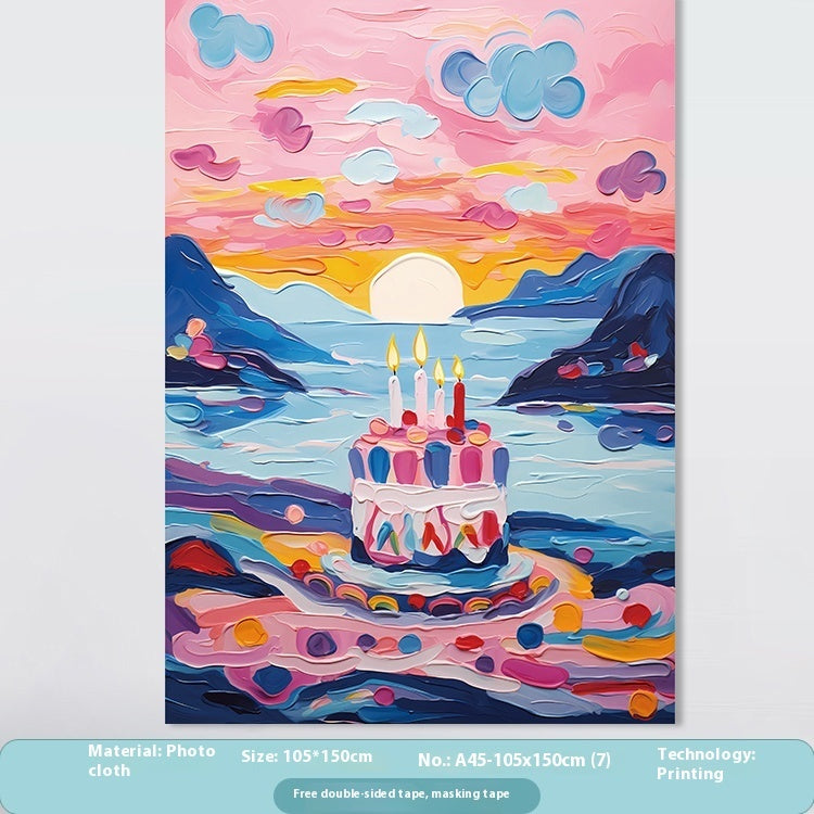 Geburtstagsfeier-Layout: Kuchen, hängendes Tuch, Kinderhintergrundwand