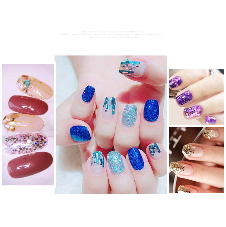 Clean the surface of the nail, grind the bottom grinder, place it on the nail and close it with a transparent processing layer, which is easy to apply to natural or artificial nails and can decorate your mobile phone, books, reader box, card, etc.