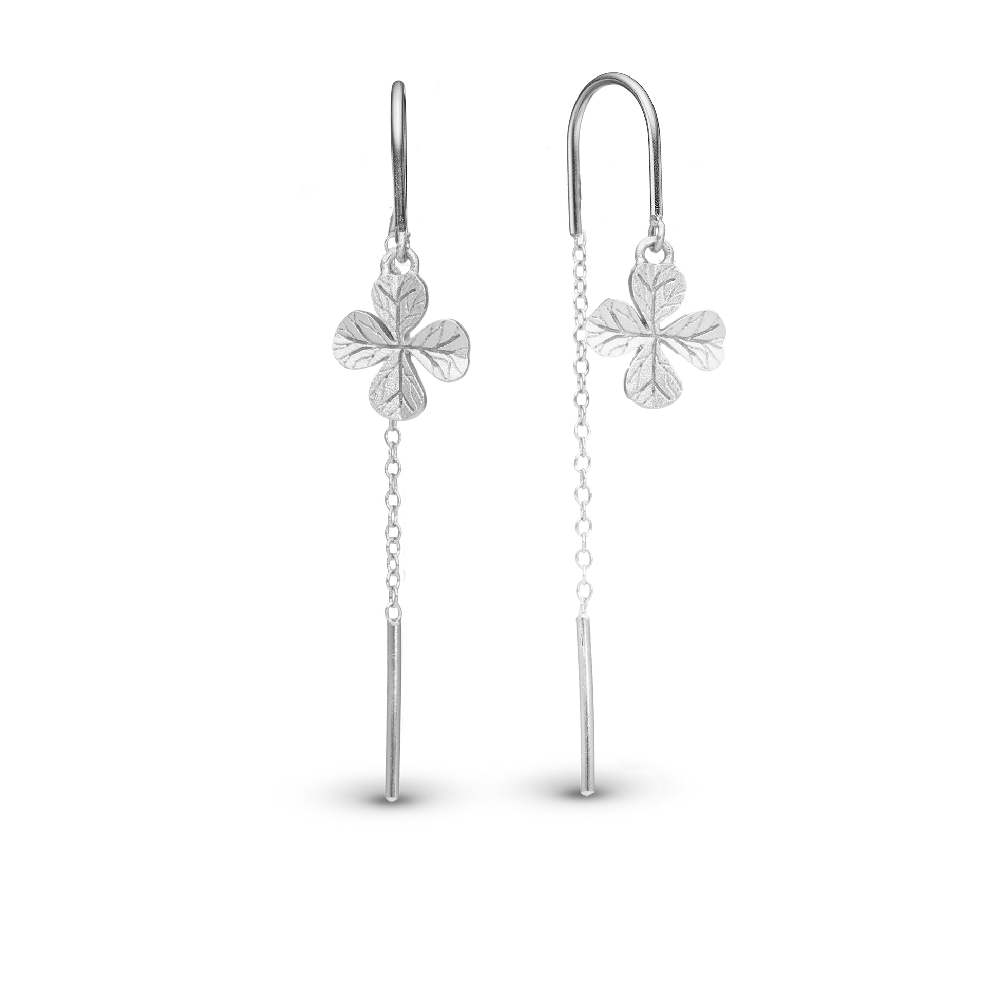 Long FoWatch Leaf Clover Dangle Earring - Brushed Sterling Silver